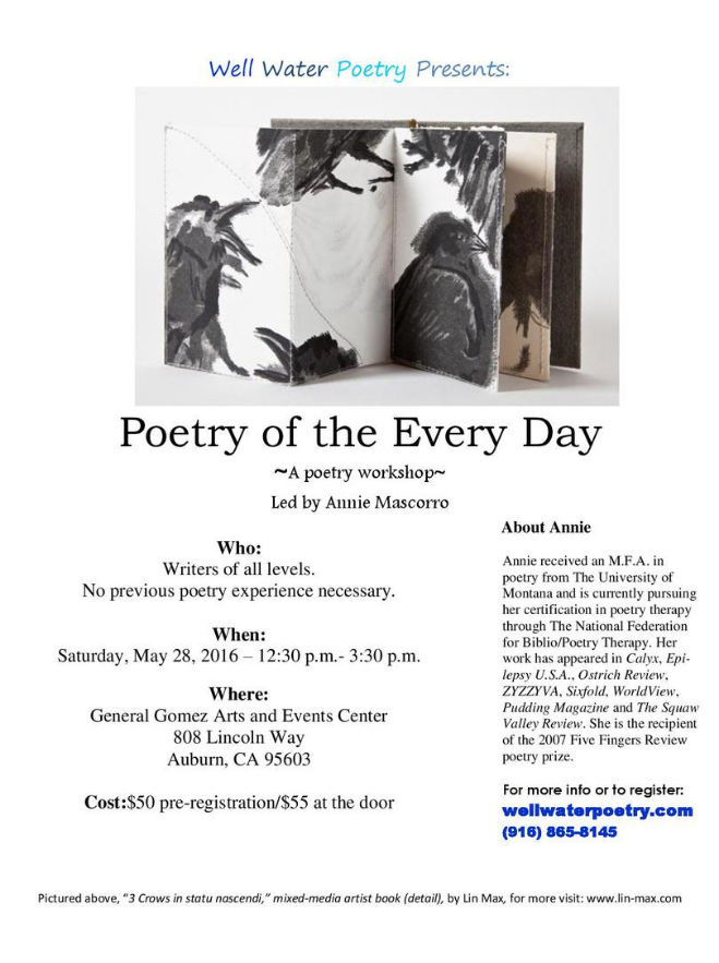 Materials: Please bring paper and a pen, an openness to new ideas, and a willingness to share your feelings with the group. Poems will not be posted or distributed before the workshop. A fresh, first reading of the poem for everyone will help us to tap into our initial emotional responses to it.